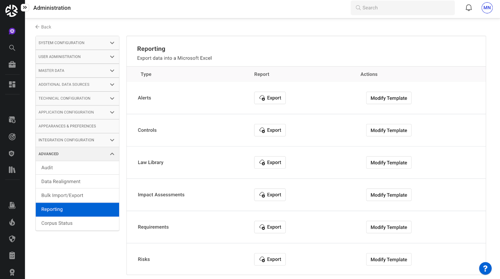 The Advanced module offers powerful tools for data realignment, auditing, bulk import/export operations, and reporting. These features enable administrators to efficiently transfer data, update configurations, and manage compliance repositories.