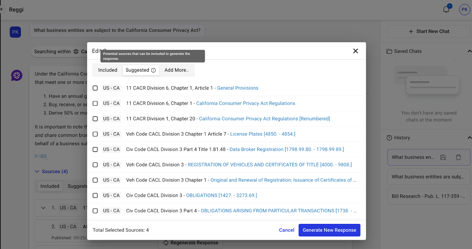 With the new "Edit Sources" feature, users can refine the sources considered to generate the response. Sources can be included from the Reggi suggested list, excluded from the existing list, or manually added, ensuring responses are based on the most relevant information.