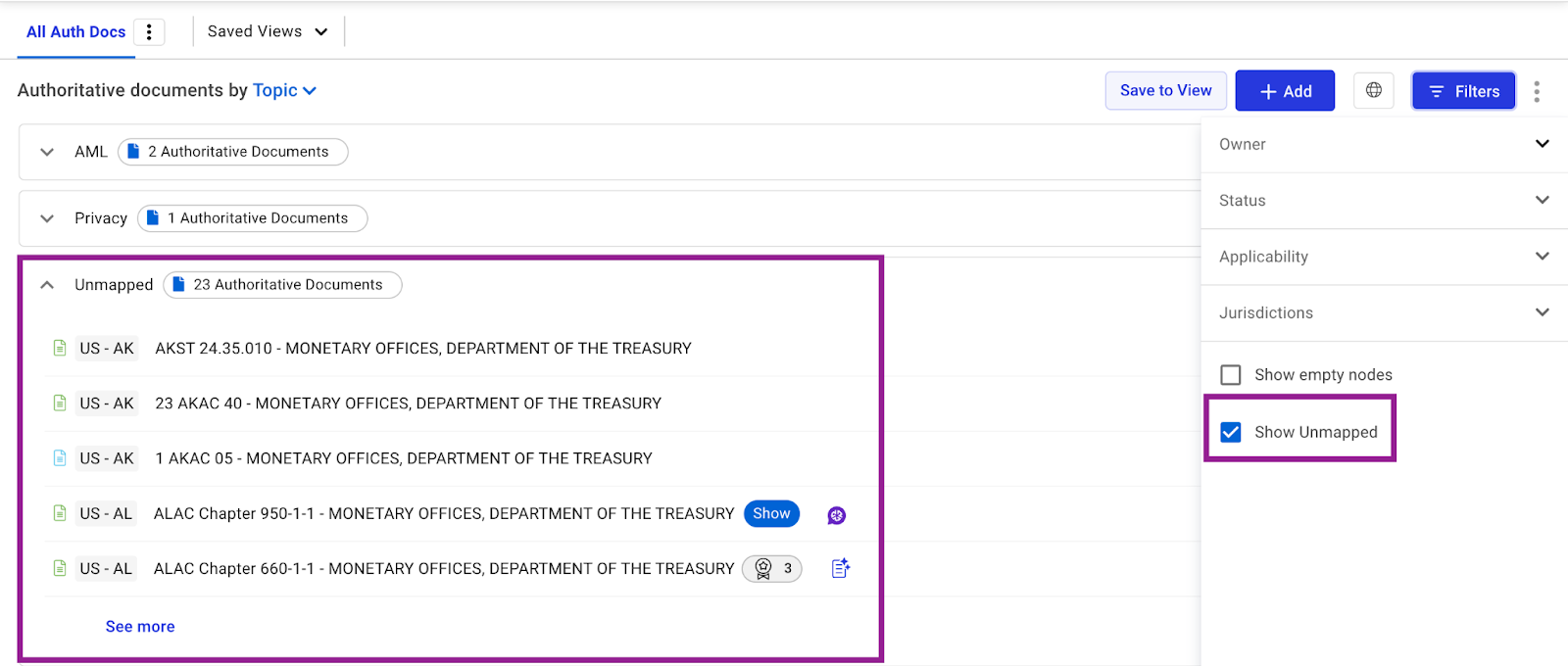 Regology recommends mapping all authoritative documents in your law library to relevant topics for better organization. This ensures regulatory change alerts are categorized by topic and directed to the appropriate stakeholders. A new "Show Unmapped" filter has been introduced to easily identify unmapped documents. Administrators can activate or deactivate this feature in the “Law Library” configuration settings.
