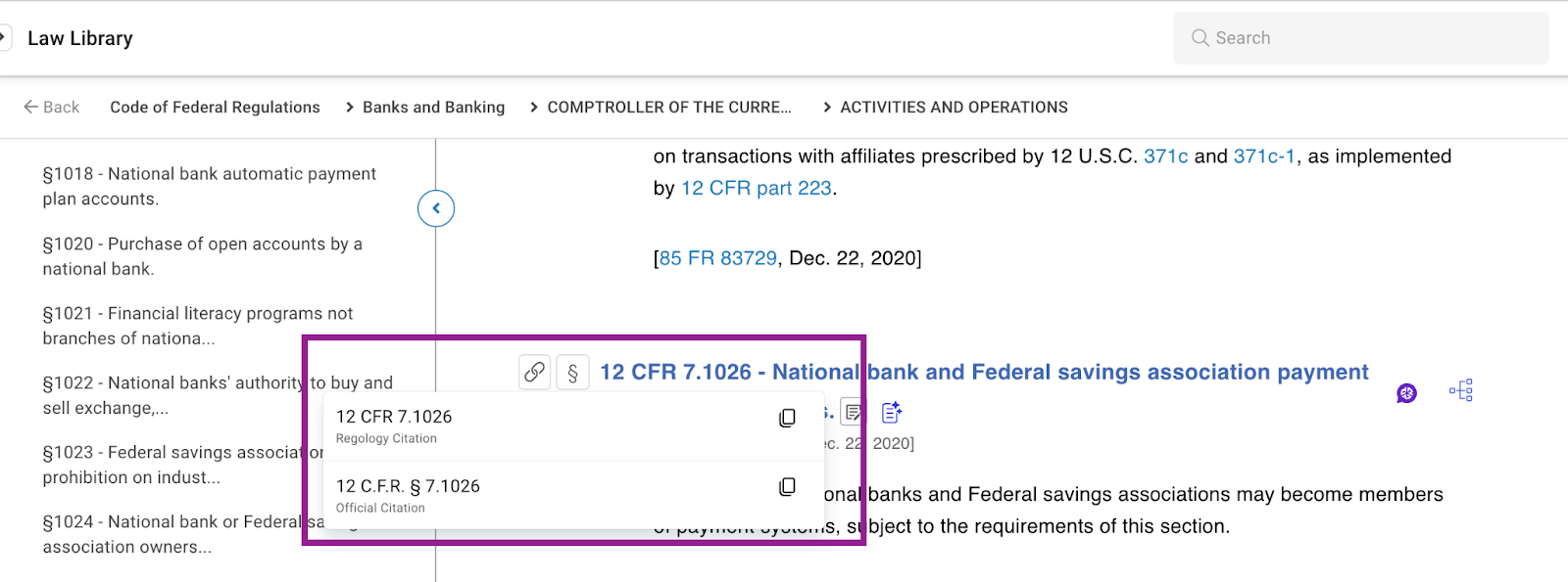 Users can now view and copy the official citations of authoritative documents, which typically follow the Bluebook citation format.