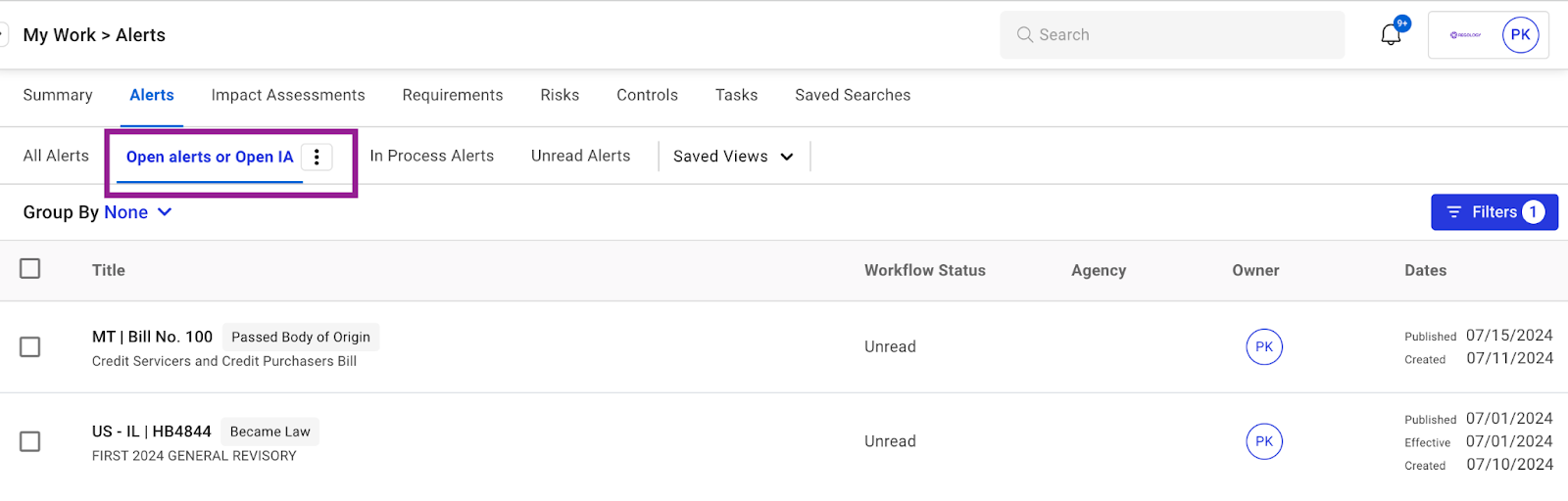 We’ve added a default saved view in the Alerts tab under My Work, specifically tailored for "Open Alerts” or “Open IA". This view automatically filters out alerts and impact assessments that are in open status, making it easier for users to focus on managing their tasks. This update is part of our efforts to simplify navigation and improve efficiency within Regology, helping users quickly access and prioritize their open tasks.