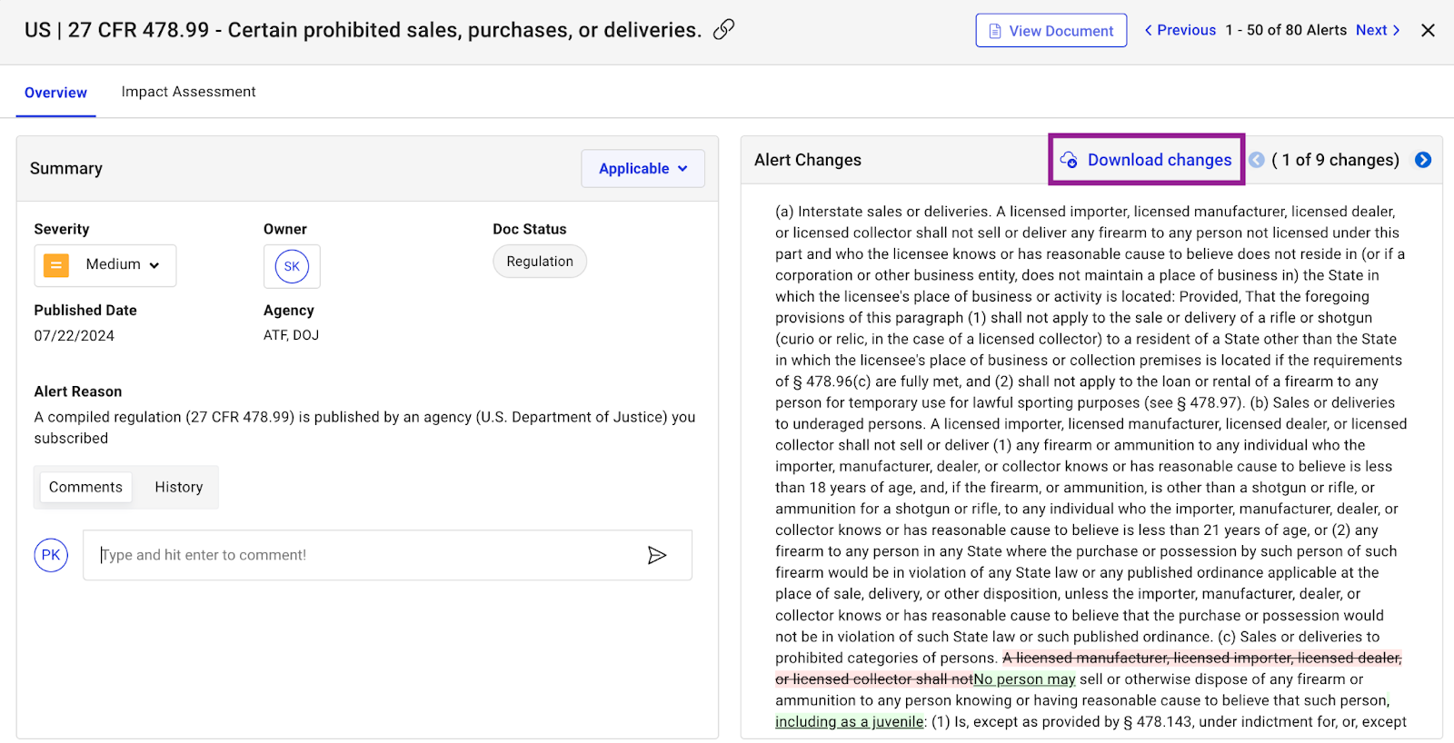 From Regulatory Change alert view, users can download regulation redline changes as a PDF for sharing and reviewing outside Regology. This feature is available for Regulatory Changes.
