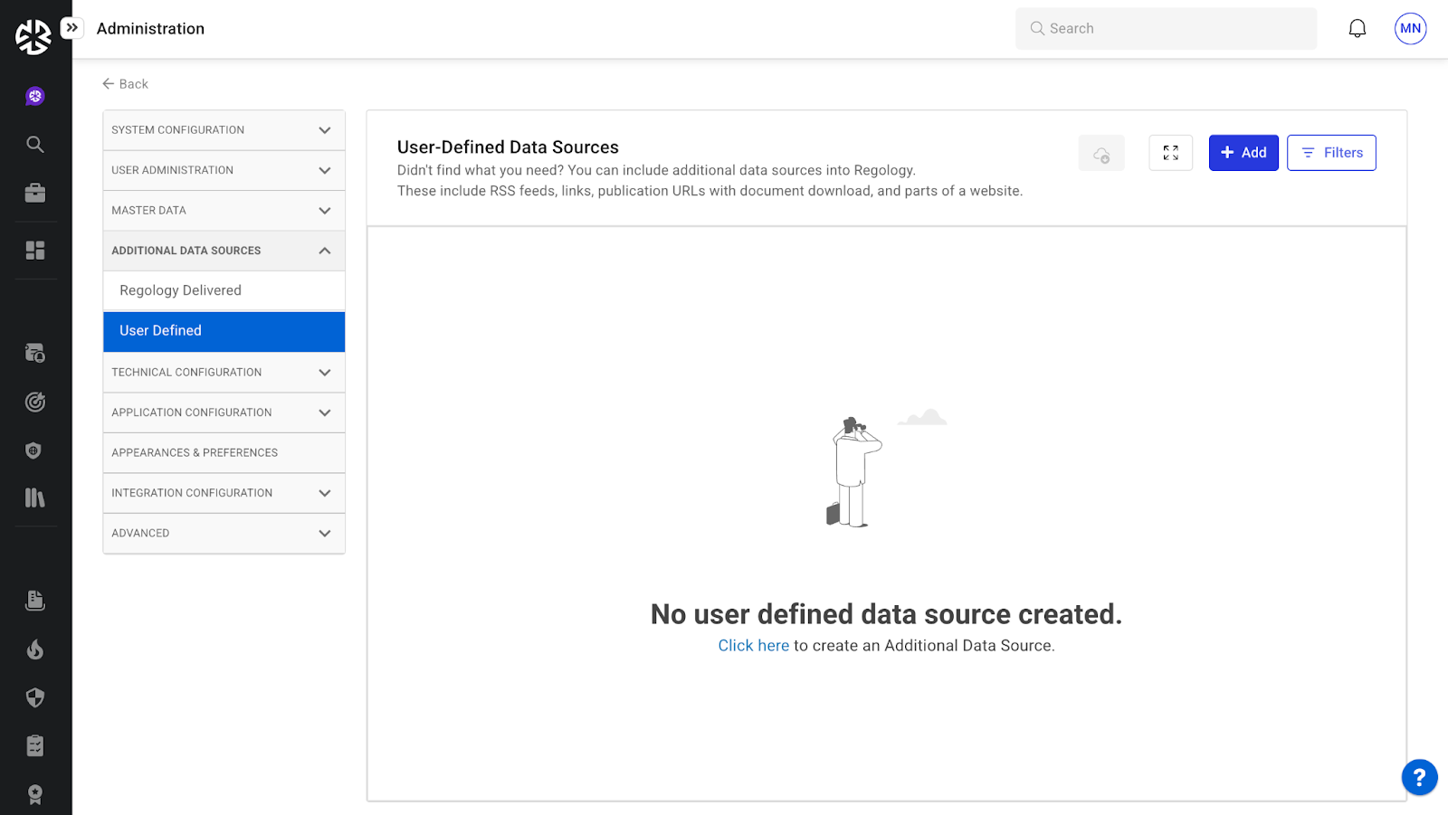 Regology では、追加データ ソースへの接続および管理を簡単に行えます。「Regology 提供ソース」 を購読したり、独自の 「ユーザー定義ソース」 を統合したりできます。ここでは、追加データ ソースを購読、管理、およびフィルタリングするプロセスについて説明します。