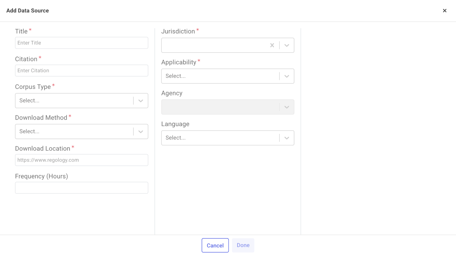 必要なデータ ソースが Regology 提供リストで利用可能でない場合、データ ソースを手動で追加して構成できます。