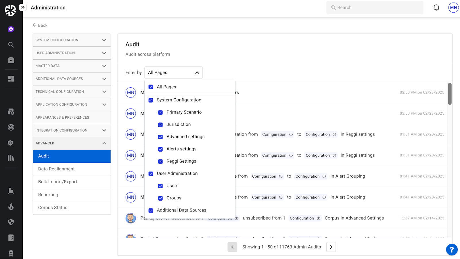 「上級」 モジュールは、データの再調整、監査、一括インポート/エクスポート操作、レポート作成のための強力なツールを提供します。これらの機能により、管理者はデータを効率的に転送したり、構成の更新やコンプライアンス リポジトリの管理を行ったりすることができます。