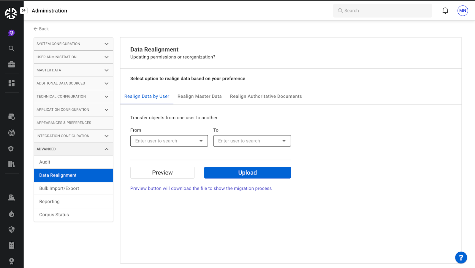 [データの再調整] 機能により、管理者はコンプライアンス オブジェクトをユーザー間で転送できます。