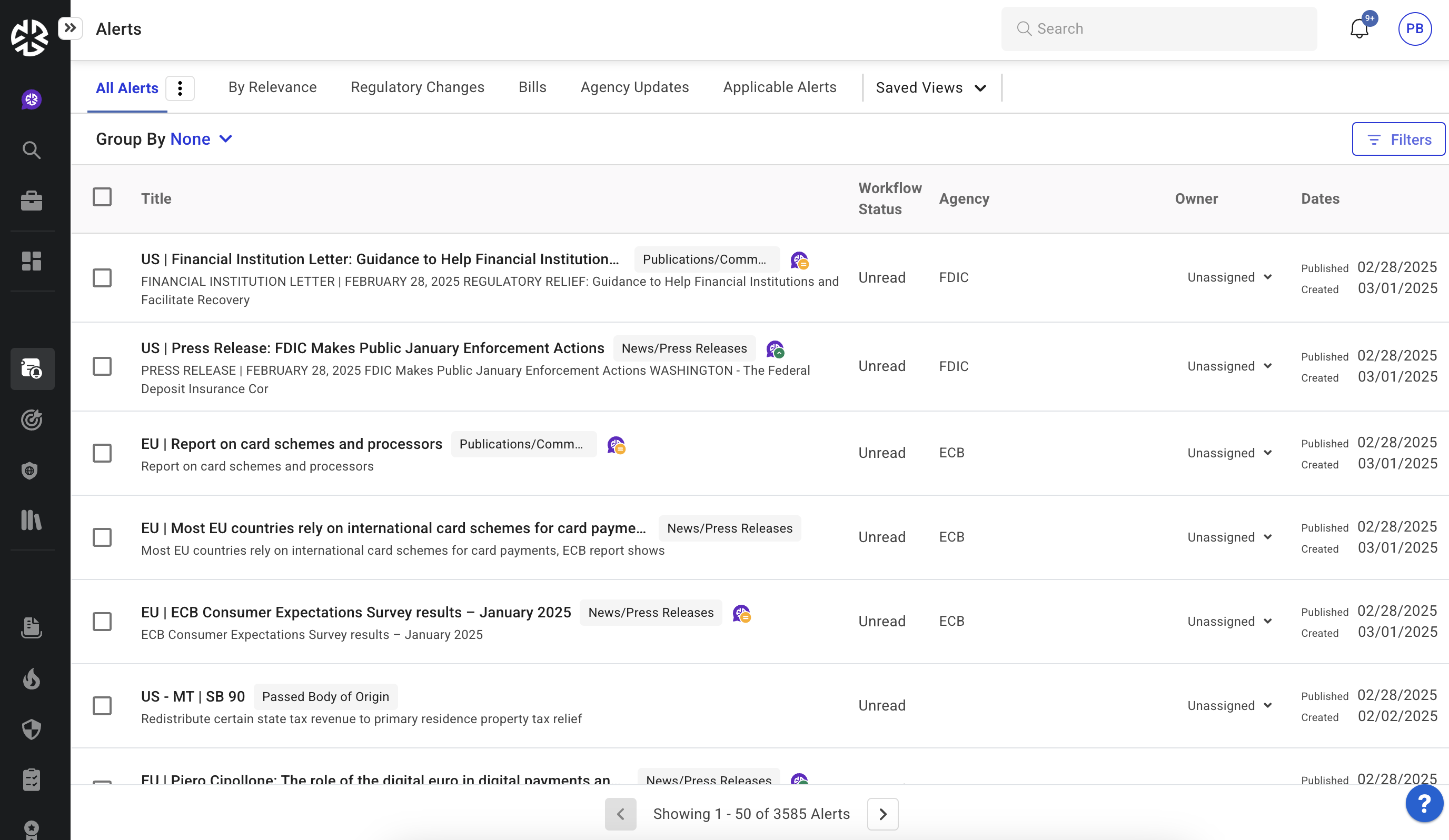 Regology のアラートは、法案、法律、規制の変更、および機関の更新について通知します。アラートは、法律ライブラリとカスタマイズ可能な設定を基に生成されます。これらのアラートは、手動で割り当てることも、ルーティングを通じて自動的に割り当てることもできます。すべてのアラートまたは必要なアラートのみの通知を購読できます。