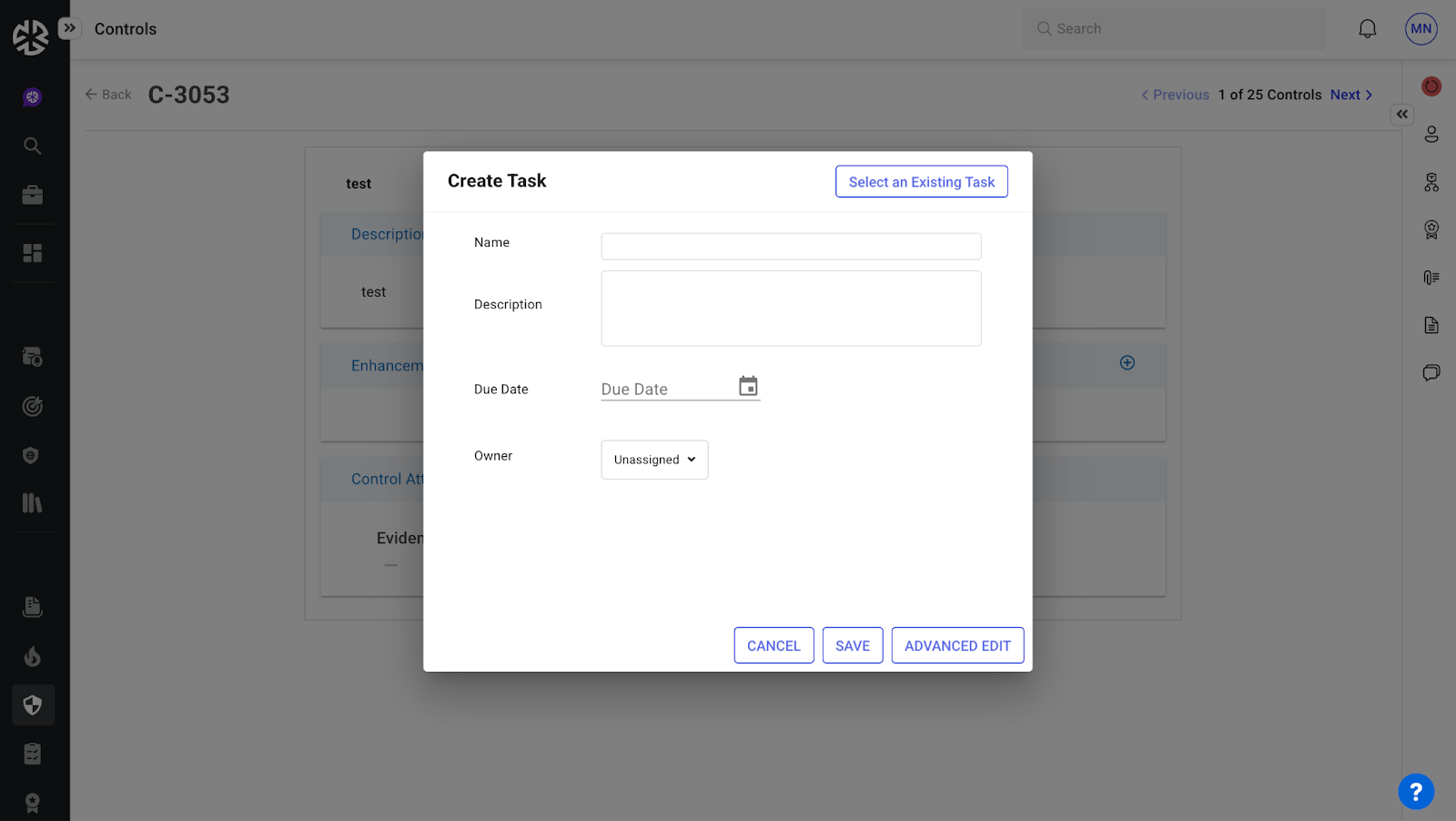 検索バーを使用して既存のコントロールを検索して割り当てるか、[作成] をクリックして新しいコントロールを追加します。