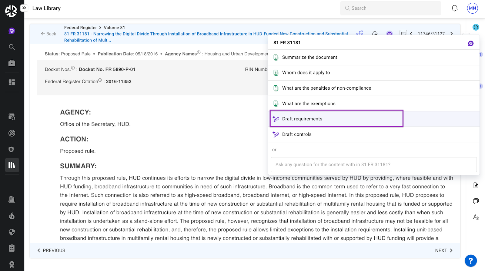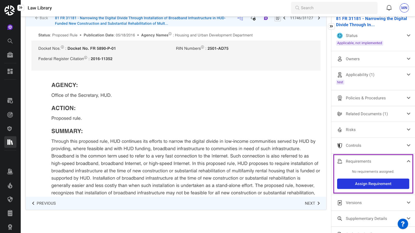 公式文書の中で、規制要件を定義する部分を選択します。[要件の追加] アイコンをクリックする。