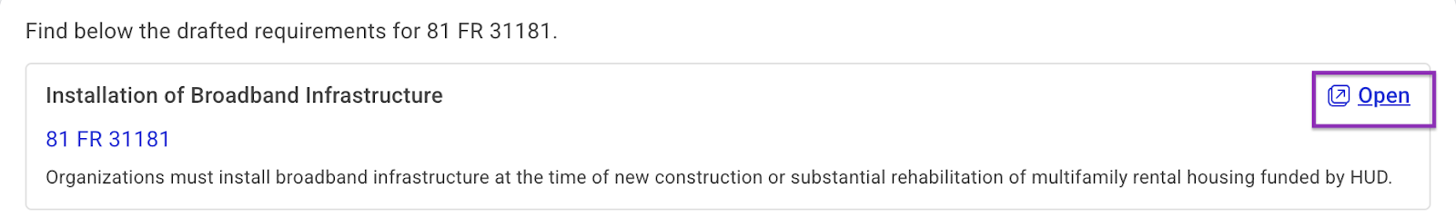保存された要件の詳細を表示するには、[開く] をクリックします。