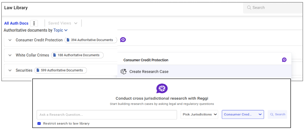 ここでは、Regology の法律ライブラリで特定のトピックに関する調査を開始する方法について、手順を追って説明します。Reggi を活用して、複数の管轄区域にわたる調査を実施し、選択したトピックの公式文書に基づいて調査ケースを作成できます。