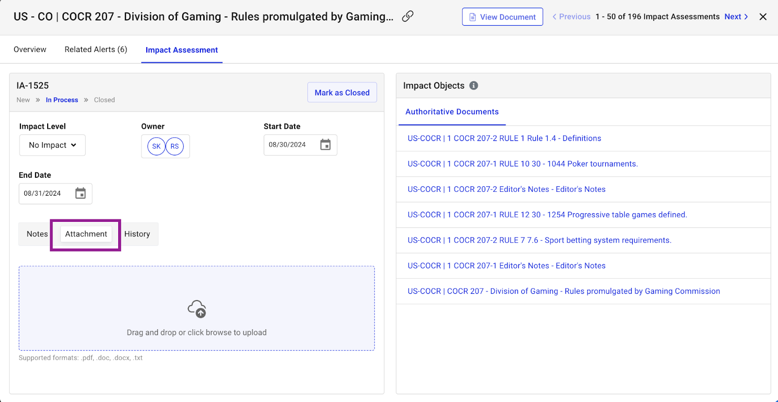 Users can now attach a file directly to the Impact Assessment page. A new “Attachment” tab allows uploading, replacing, downloading, and deleting the document. You can attach only one file.