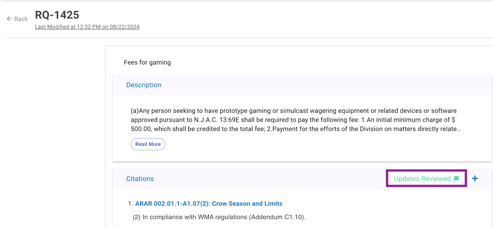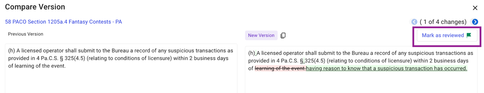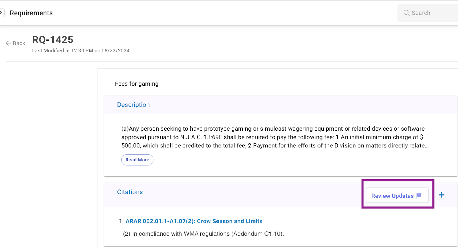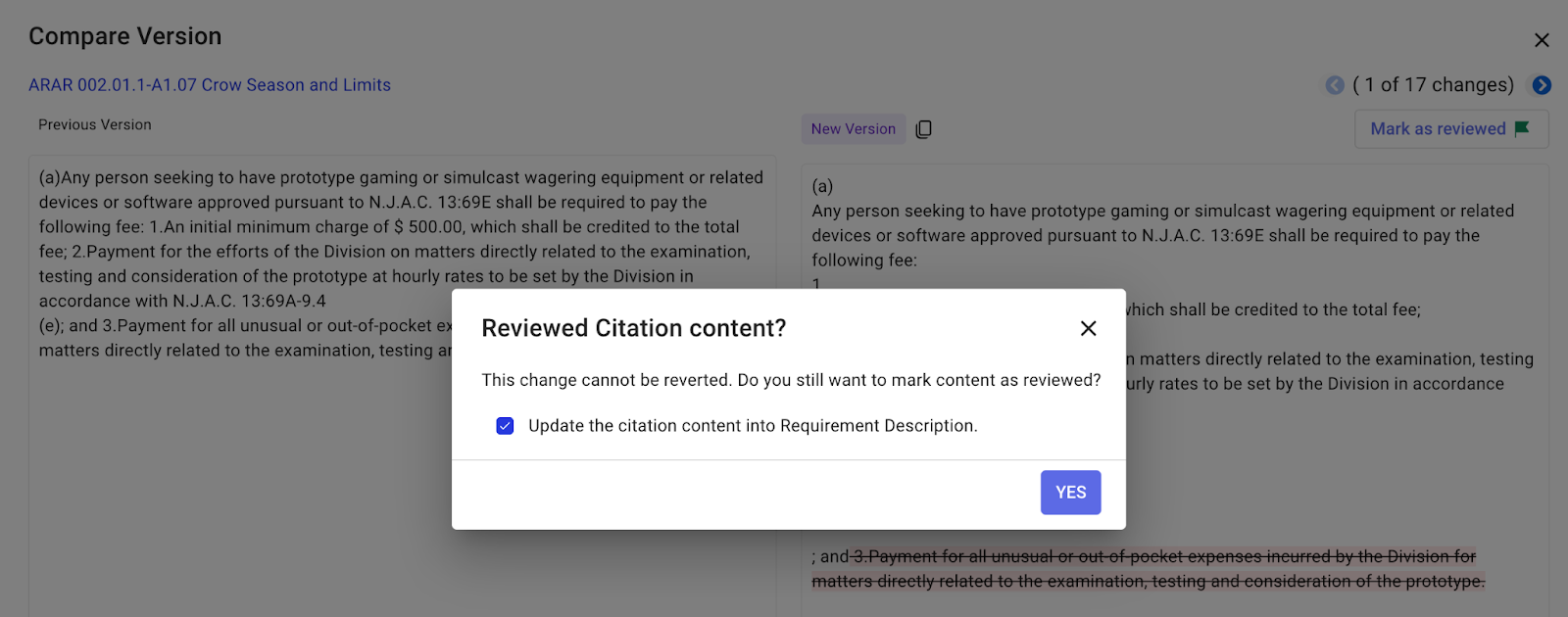 This feature allows you to review and update requirement citation content, whenever the original regulation text changes.