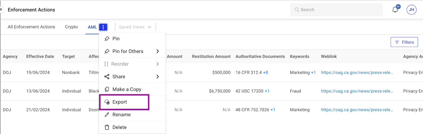 We've introduced export functionality within the Enforcement Actions module, enabling users to export data based on their Saved Views. The module is now accessible in the Reporting tab under the Administration section, featuring options to Export and Modify Templates for customized reporting.