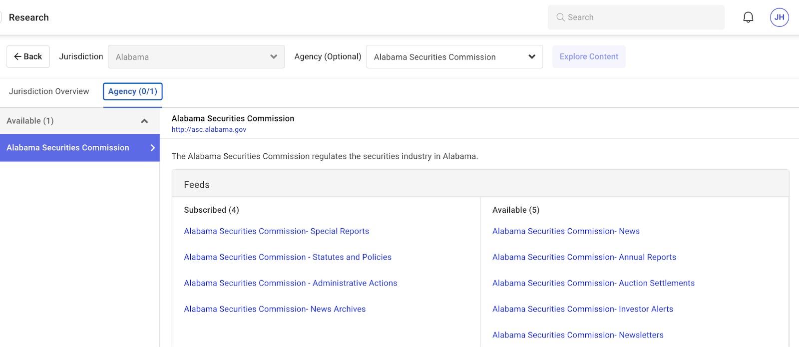 A new search feature has been added to the "Explore Content" tab, allowing users to quickly search and explore jurisdictions and agencies within Regology, streamlining the content discovery process.