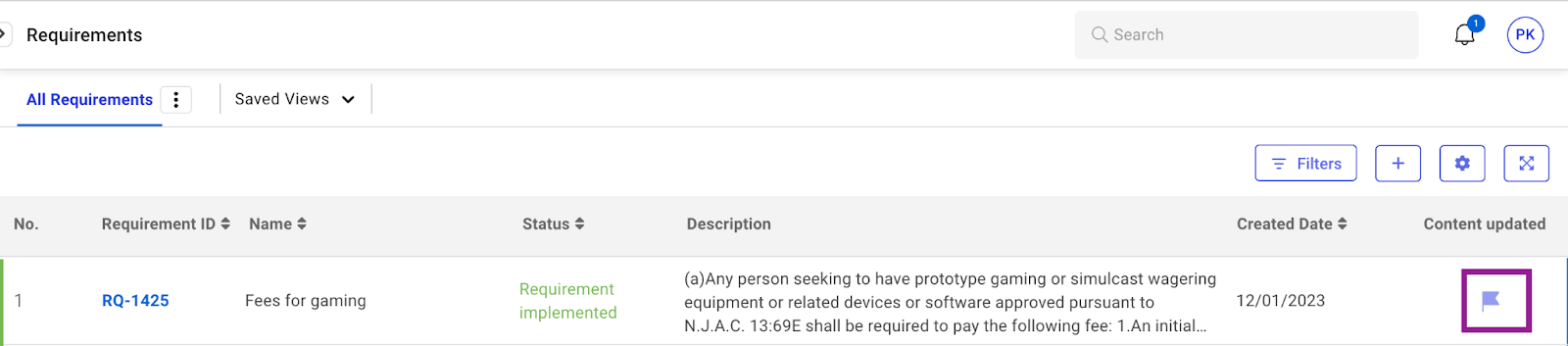 1. Users can now view redline changes and update requirement language as needed. By clicking "Review Updates," a popup will display a side-by-side comparison of the old and new versions. Users can mark the changes as reviewed, update the requirement description, and copy the new text version. Once the review is completed, the button changes to "Updates Reviewed," streamlining the update process.