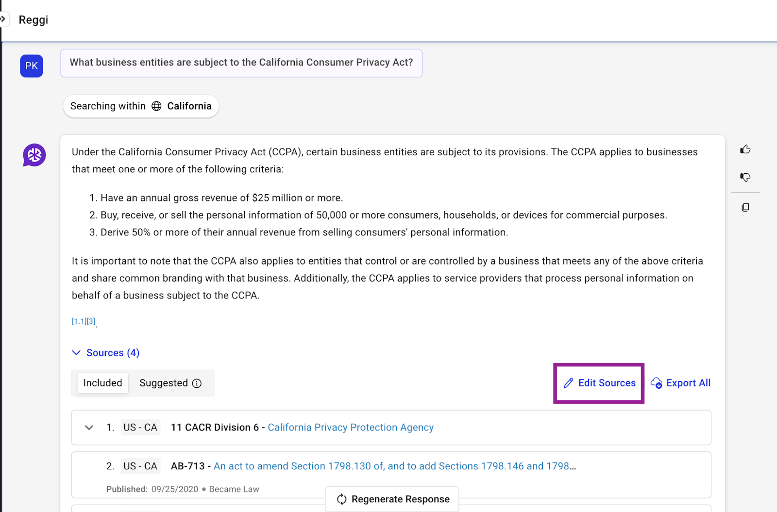 With the new "Edit Sources" feature, users can refine the sources considered to generate the response. Sources can be included from the Reggi suggested list, excluded from the existing list, or manually added, ensuring responses are based on the most relevant information.
