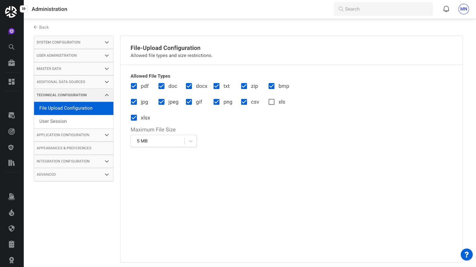 技術構成セクションでは、ファイルのアップロードとユーザー セッション設定を管理するための重要な制御が提供されます。これらの構成を適切に定義することで、管理者はプラットフォームのセキュリティと使いやすさを強化できます。