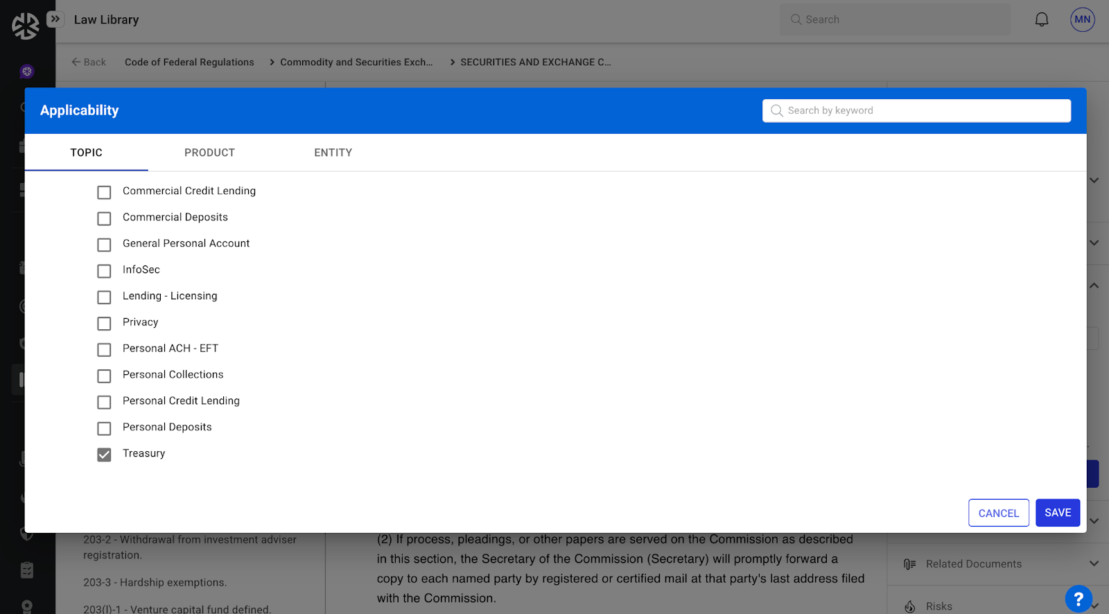 文書を管轄区域別、トピック別、またはエンティティ別に表示するには、[公式文書の表示基準] ドロップダウンを使用します。