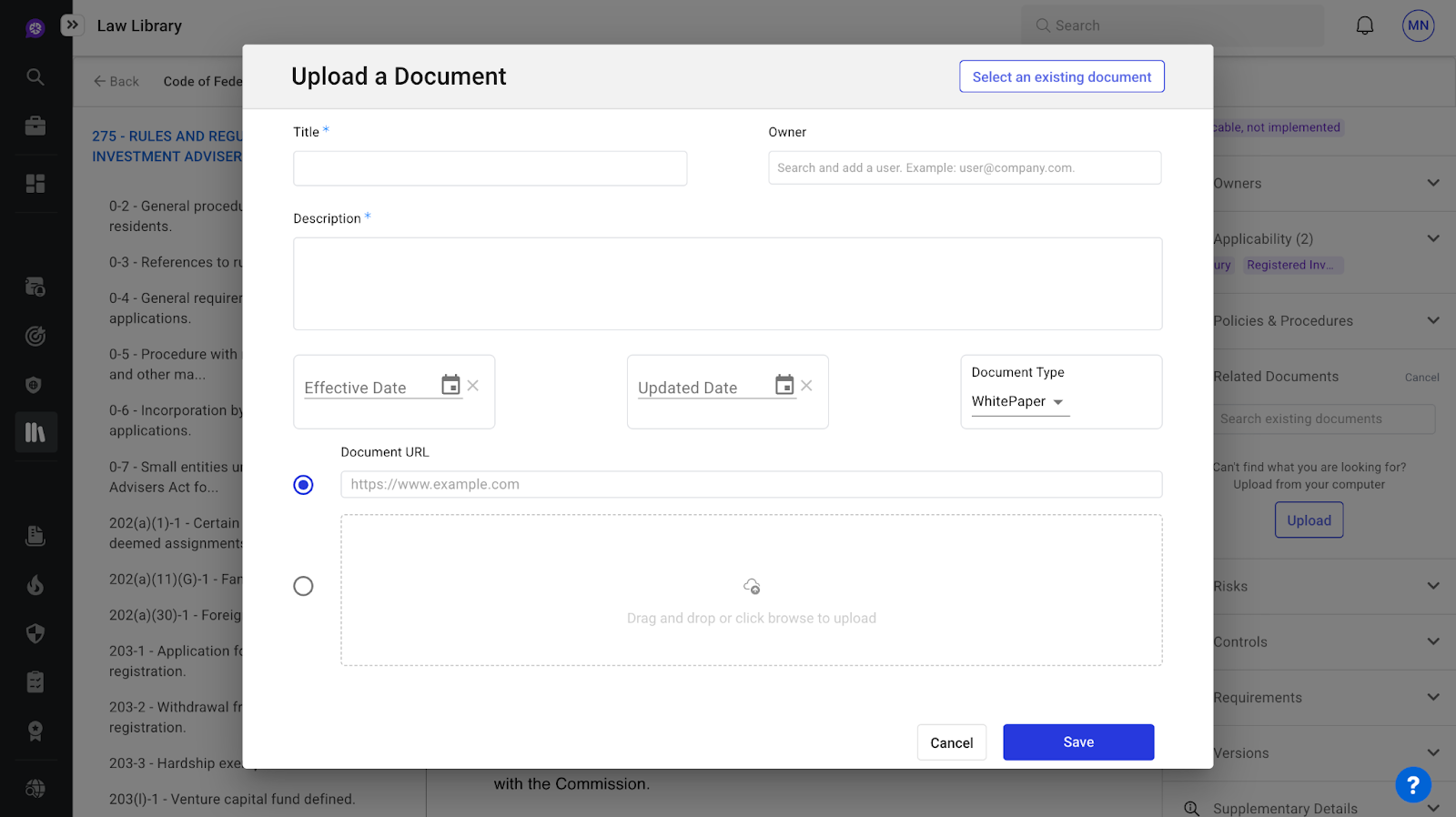 [添付] をクリックして既存の文書を検索してリンクするか、新規文書をアップロードします。